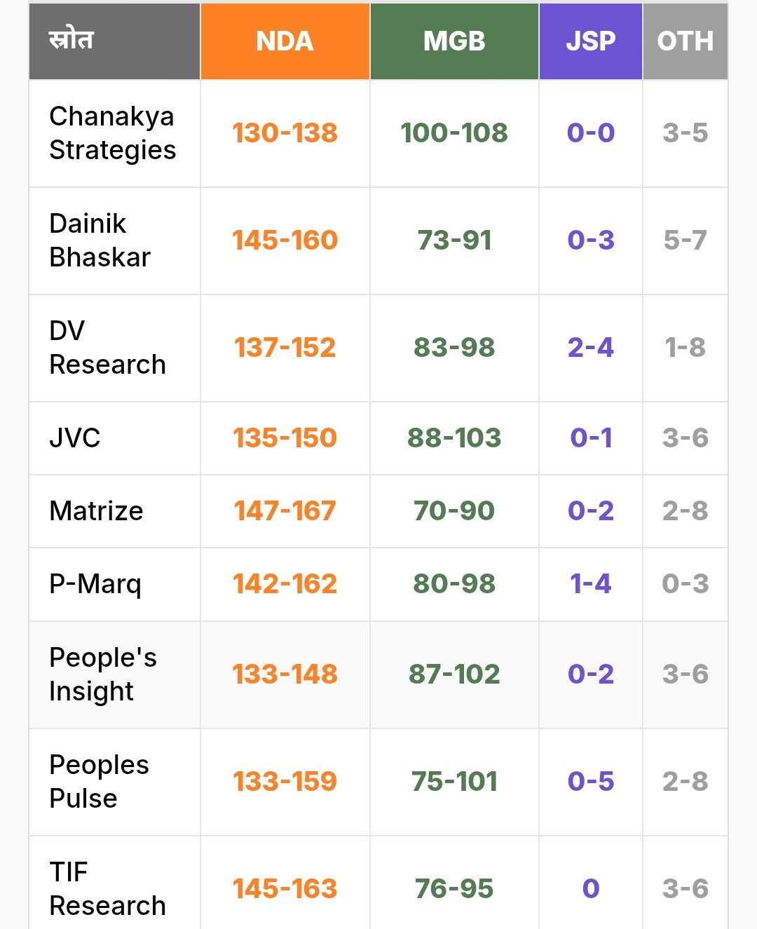 زیادہ تر ایکزٹ پولز نے مہاگٹھ بندھن کو واضح اکثریت دی تھی، جبکہ صرف دو—ٹوڈیز چانکیہ اور ٹائمز نیٹ ورک—نے اسے اکثریت نہیں دی تھی۔