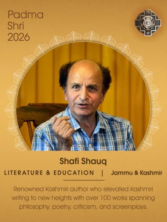 سری نگر کے معروف کشمیری اسکالر شاعر ماہر لسانیات اور مترجم پروفیسر شفیع شوق کو پدم شری ایوارڈ 2026 کے لیے منتخب کیا گیا ہے جو ہندوستان کا چوتھا بڑا شہری اعزاز ہے۔ یہ اعزاز انہیں تعلیم زبان اور ادب کے میدان میں غیر معمولی خدمات کے اعتراف میں دیا گیا ہے۔ اس اعلان کے بعد علمی اور ادبی حلقوں میں خوشی کی لہر دوڑ گئی ہے۔