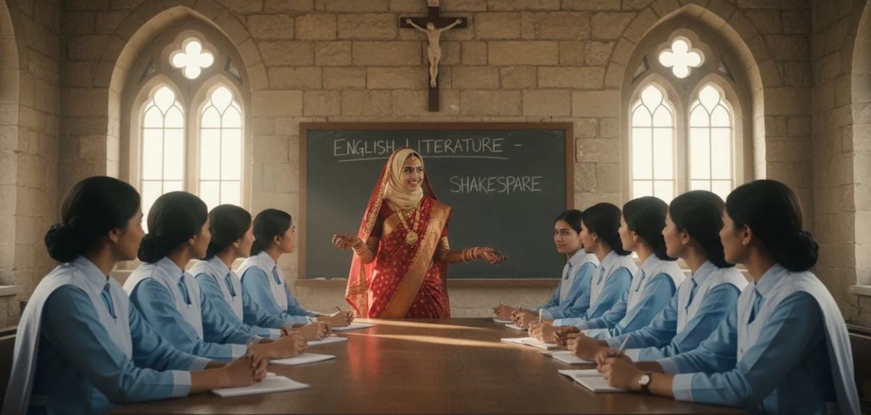 شادی کی چھٹی کے بعد ایک ہفتے میں وہ اسکول واپس آئیں۔ میں دوسری قطار میں بیٹھی تھی جب میں نے انہیں کلاس میں داخل ہوتے دیکھا۔ میں نے ان کے مانگ میں سندور کی روشن لکیر دیکھی۔ کلائیوں میں سرخ اور سفید چوڑیاں جھلک رہی تھیں۔ اور گلے میں منگل سوتر خاموشی سے ٹکا ہوا تھا۔اس لمحے پوری کلاس جیسے ایک ساتھ ٹھہر گئی۔ فضا میں ہلکی سی الجھن تیرنے لگی۔ ہم مذہبی حدوں کو پوری طرح نہیں سمجھتے تھے لیکن اتنے بڑے ضرور تھے کہ غیر معمولی بات کو محسوس کر سکیں۔ آخر ایک طالبہ نے ہمت کر کے آہستہ سے پوچھا۔