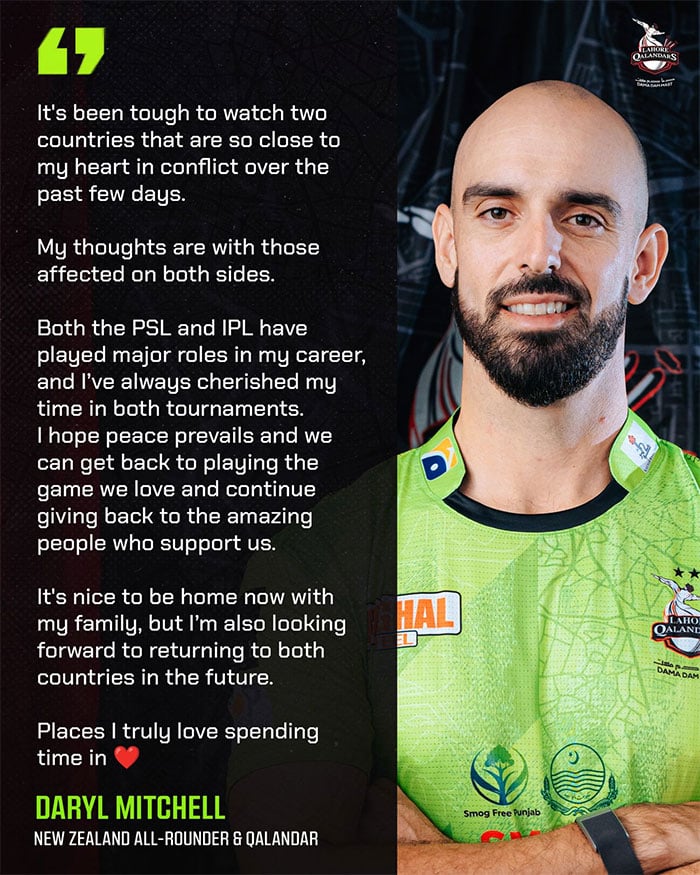 نیوزی لینڈ کے معروف کرکٹر ڈیرل مچل نے پاکستان اور بھارت کے درمیان حالیہ کشیدگی پر گہری تشویش کا اظہار کرتے ہوئے دونوں ممالک کے لیے امن کی دعا کی ہے۔ مچل اس وقت متحدہ عرب امارات اور نیوزی لینڈ کے درمیان سفر میں ہیں اور دورانِ پرواز سوشل میڈیا کے ذریعے اپنے جذبات کا اظہار کیا۔ڈیرل مچل نے لکھا کہ گزشتہ چند دنوں میں دو ایسے ممالک کے درمیان کشیدگی دیکھنا انتہائی تکلیف دہ رہا ہے جو میرے دل کے بےحد قریب ہیں۔ میری دعائیں ان تمام افراد کے ساتھ ہیں جو اس صورتِ حال سے متاثر ہوئے ہیں۔ڈیرل مچل نے پاکستان سپر لیگ (پی ایس ایل) اور انڈین پریمیئر لیگ (آئی پی ایل) میں اپنی شرکت کو اپنے کیریئر کے اہم سنگ میل قرار دیتے ہوئے کہا کہ پی ایس ایل اور آئی پی ایل دونوں نے میرے کیریئر میں کلیدی کردار ادا کیا ہے۔ میں ان دونوں ٹورنامنٹس میں گزارے ہوئے وقت کو ہمیشہ قدر کی نگاہ سے دیکھتا ہوں۔