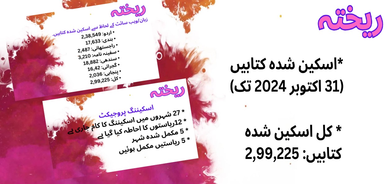 ریختہ پرموجود ای-کتاب گوشہ اردو کتابوں کی ایک محدود تعداد کے ساتھ اس طرح شروع کیا گیا تھا کہ اردو کتابوں کا ایک چھوٹا موٹا آن لائن کتب خانہ تشکیل دے دیا جائے۔ مگر دیکھتے ہی دیکھتے اس نے ایک زبردست مہم اور مشن کی صورت اختیار کرلی۔اب ریختہ ویب سائٹ اپنے تمام تر عزائم اور وسائل کے ساتھ عالمی سطح پراردو ڈیجٹ کاری مشن میں مصروف ہے۔ اس سلسلے میں پہلی بڑی پیش رفت انجمن ترقی اردو ہند کے ذمے داروں کی مدد سے ہوئی جنہوں نے اپنے موقر کتب خانے کے دروازے ریختہ پر کھول دیے۔جس کے تحت اب تک اس کتب خانے کی تقریباً 20 ہزارکتابیں سائٹ پر اپ لوڈ کی جاچکی ہیں۔ اس کے علاوہ رضا لائبریری رام پور کی اردو کتابیں بھی ریختہ کو فراہم ہو چکی ہیں۔ خدا بخش لائیبریری، دارالمصنفین اعظم گڑھ کے علاوہ ہندوستان کی 37 لایبریریوں اور ذاتی کلیکشن تک رسائی ہو چکی ہے۔ ممتاز نقاد جناب شمس الرحمان فاروقی کے ذاتی کتب کا ادبی سرمایہ بھی ریختہ کو دستیاب ہوچکا ہے جس میں داستان امیر حمزہ کی46 جلدیں بھی شامل ہیں جو پہلی بار ریختہ پر آن لائن کی گئی ہیں۔ ممتاز نقاد مرحوم خلیل الرحمان اعظمی کے ذاتی کتب خانے تک بھی ریختہ کی رسائی ہوچکی ہے۔ اس کے علاوہ ایک اور بڑی پیش رفت راجہ محمودآباد کے قدیم اور موقر کتب خانے تک ریختہ کی رسائی ہے جہاں اردو ادب کے بہت سے جواہر پارے ڈیجٹ کاری کے ذریعے محفوظ کئے جانے کے منتظر ہیں۔