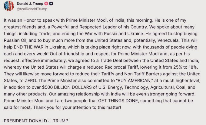 امریکی صدر نے سوشل میڈیا پر لکھا کہ آج ہندوستان کے وزیر اعظم مودی سے بات کرنا اعزاز کی بات تھی۔ وہ میرے قریبی دوست ہیں اور اپنے ملک کے طاقتور اور باوقار رہنما ہیں۔ ہم نے تجارت اور روس یوکرین جنگ کے خاتمے سمیت کئی موضوعات پر گفتگو کی۔ ٹرمپ نے یہ بھی دعویٰ کیا کہ ہندوستان روس سے تیل کی خرید بند کرے گا اور امریکہ اور ممکنہ طور پر وینزویلا سے زیادہ تیل خریدنے پر آمادہ ہوا ہے جس سے یوکرین میں جاری جنگ کے خاتمے میں مدد ملے گی۔