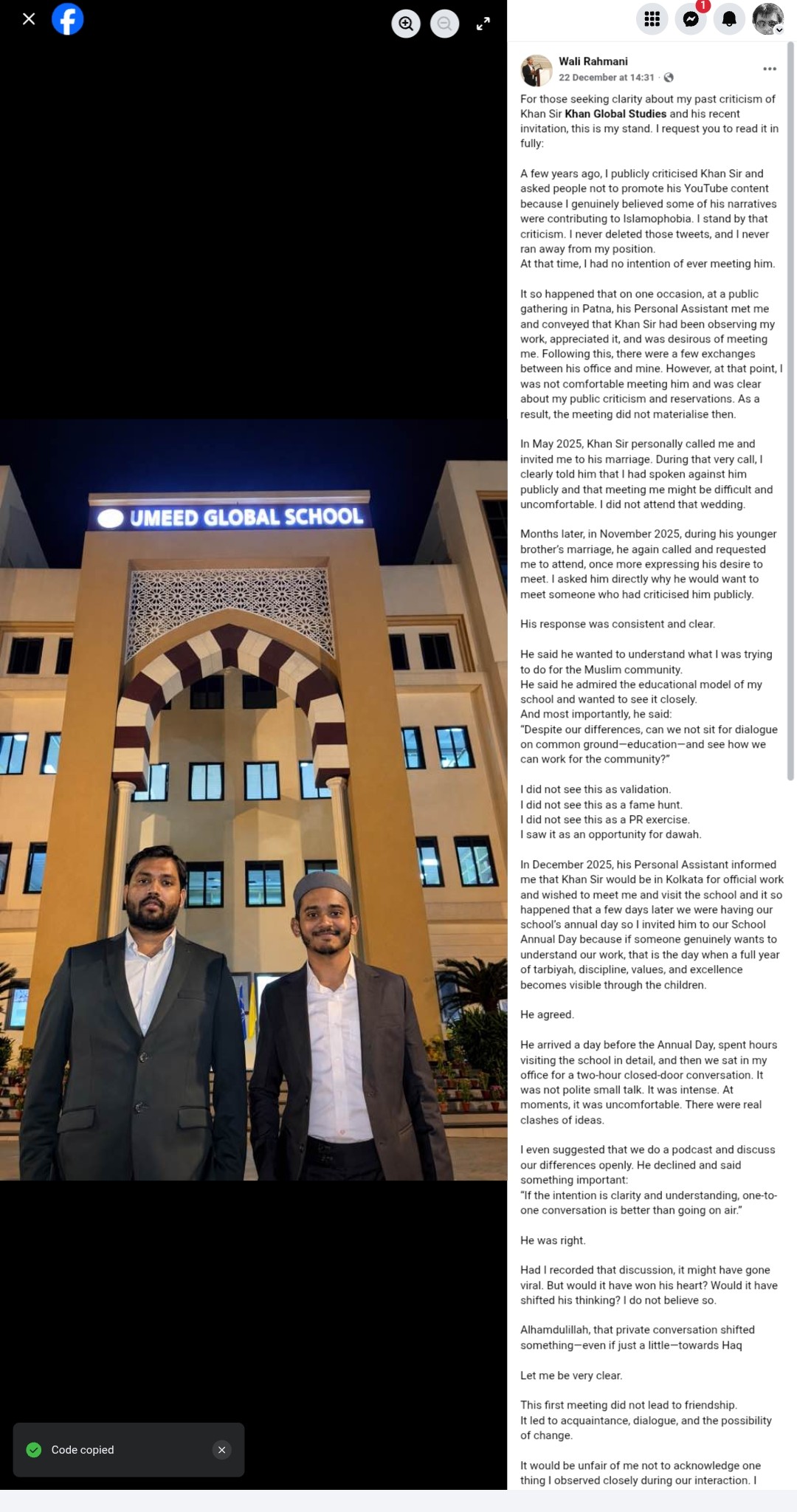 تعلیمی حلقے یہی سمجھ رہے تھے کہ یہ دونوں چہرے کبھی ایک فریم میں نظر نہیں آئیں گے۔ لیکن ولی رحمانی کے بیان کے مطابق۔۔۔۔ دسمبر 2025 میں ان کے پرسنل اسسٹنٹ نے مجھے اطلاع دی کہ خان سر سرکاری کام سے کولکتہ آ رہے ہیں۔ وہ مجھ سے ملاقات کے ساتھ ہی اسکول دیکھنا چاہتے ہیں۔ اتفاق سے چند دن بعد ہمارے اسکول کا سالانہ پروگرام تھا۔ میں نے انہیں اسکول کے سالانہ دن کی دعوت دی ۔انہوں نے دعوت قبول کر لی۔